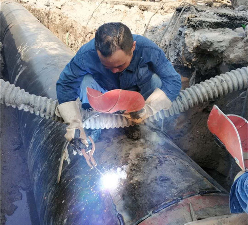 在砂石混合的沟槽里焊接,防护面具和防护服的双重覆盖,加上焊接的火花,承受的高温可想而知。