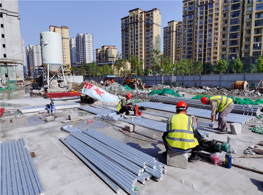 在工地上加工管材,水泥块是临时坐凳,在阳光的炙烤下,管材格外烫手。