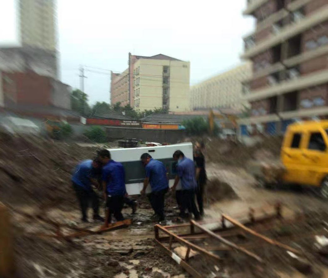 在接到客户的通知后,8月18号当天公司领导立刻组织专人专班对长大泵房进行二次供水设备的安装调试。此次设备安装时间紧急,且为我司安装的第一套表后无负压供水设备,两位班长深知此次任务的紧急困难,立刻开始组织人员将设备搬运上车,两辆载着设备的车辆到达设备安装场地后,班长徐大强立刻发现了一个棘手的问题:施工场各处都被挖机挖断,没有一条道路可以通向我们安装设备的泵房。徐班长当机立断马上联系相关负责人为我们填平一个口子。因为场地全是刨土,车辆进入后轮胎开始打滑,无法通行,所有组员立刻下车推车,靠着大伙的力量终于将第一车设备顺利送进了泵房。正当第一车的泵房基本设备安装完毕后,天空却开始下起了小雨,当开始搬运电控柜时已是大雨倾盆,载着电控柜的汽车深陷泥泞中无法前进,道路也因施工再次被挖断,大雨冲刷着大地,更对我们的严竣考验,客户要求的日期迫在眉睫,此时此刻想要完成任务只能靠我们人工搬运设备,两位班组长身先士卒跳进雨中,迎着暴雨,带领大家开始搬运设备,暴雨立刻湿透了全身,双眼也被暴雨淋的看不清脚下的路,施工场地上的土湿滑软粘,踩下去就很难再抬起脚来,两位班长带领着大家一步一个脚印,一米又一米的前进着,一个同事脚滑了,另一位同事立马顶上,确保设备无损坏,湿透的雨水没有阻止我们前进的脚步、满身的淤泥没有吓退我们前进的心,最终将设备完好送入了泵房进行安装。