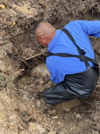 为了不影响居民的正常用水,抢修人员决定带水作业。观音垱供水服务站维修经理杨敏以身作则,一马当先,率先跳进基坑开始抢修作业。