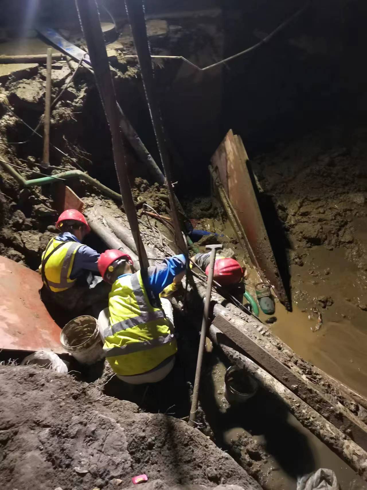 2022年5月16日晚9:30,由管网部抢修队,备齐抢修物质和设备准点关闭了附近阀门,对渗漏管道开始进行维修。此时施工现场灯火通明,大型挖掘机进行开挖,各项工作井然有序,抢修队员一干就是7个小时,直到了17日凌晨3:00,才完成了全部抢修任务,顺利通水,二医院的水压也恢复正常,而此时抢修员们由于已抢修十几个小时,已经累得直不起腰来。