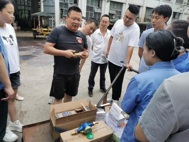 培训开始由项目部施工员熊立松对水表的相关组件进行了详细介绍,同时对水表安装的注意事项进行了讲解,水表组件中共包含了:加密表前阀、水表、铜活接头、止回阀及表后阀。