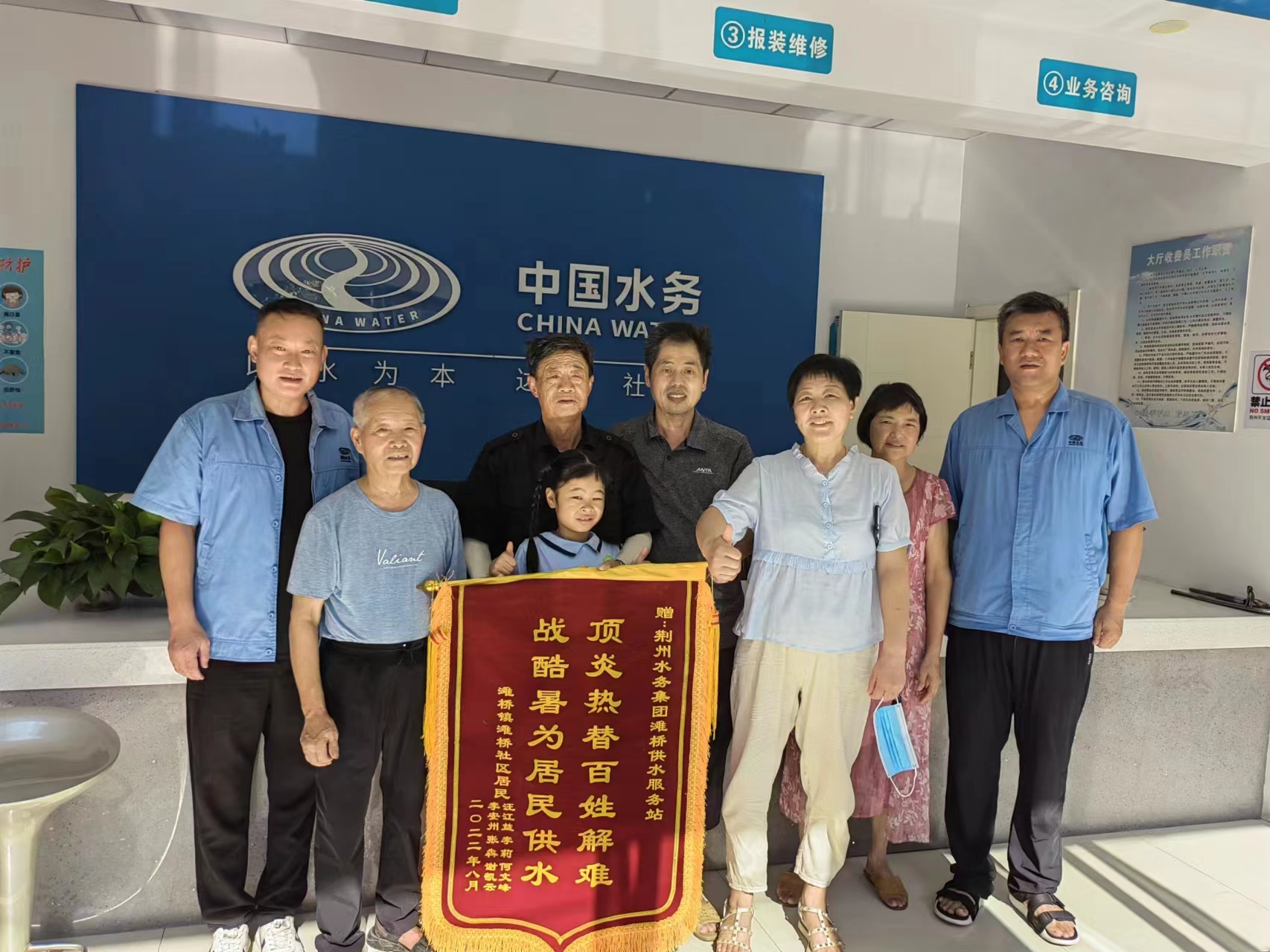 近日,滩桥北街红旗路的居民们带着一面锦旗来到荆州水务集团滩桥供水服务站,上面写着“顶炎热替百姓解难,战酷暑为居民供水”,以感谢滩桥供水服务站心系用户的优质服务。