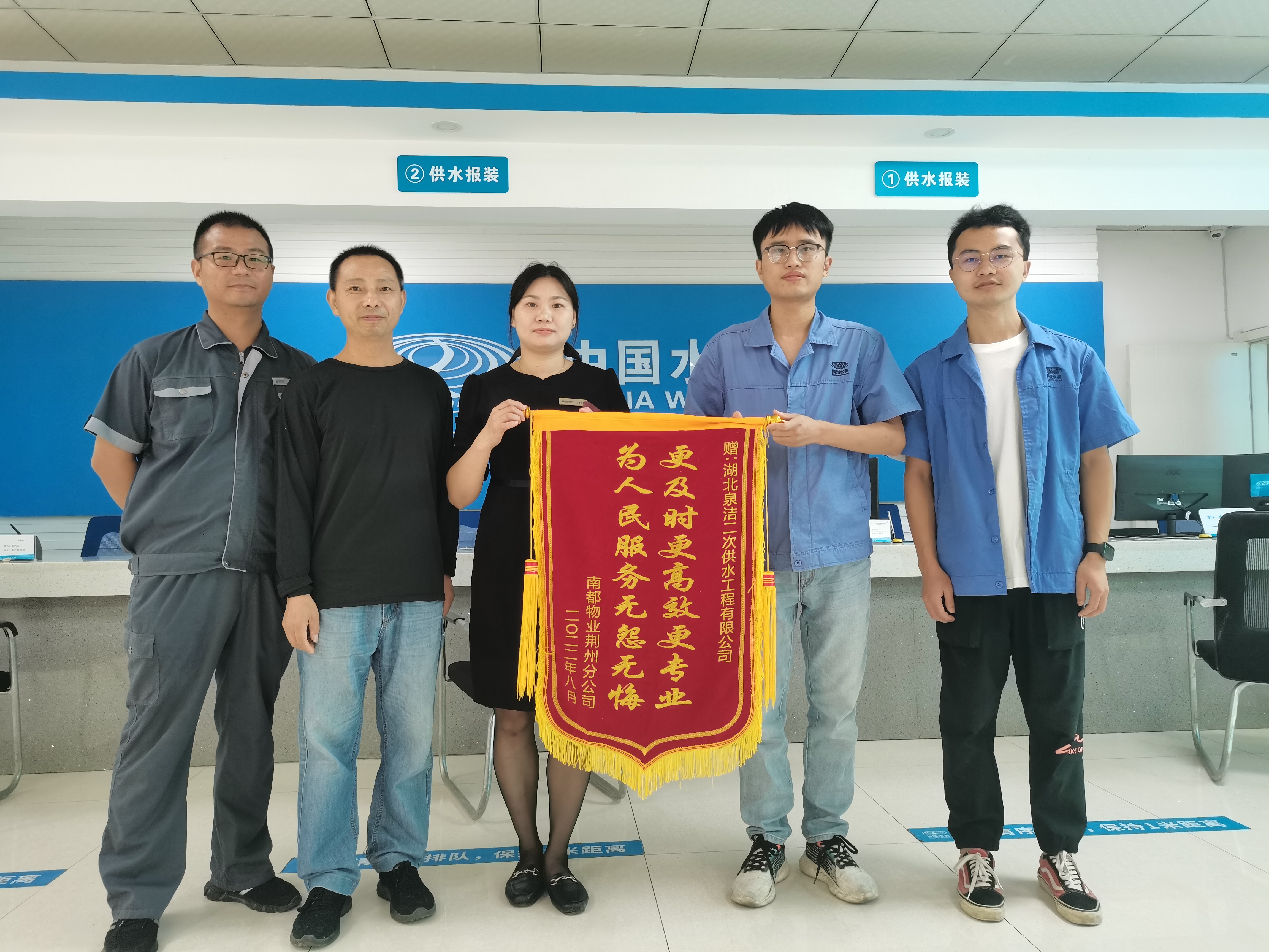 在8月30号,绿地二期南都物业荆州分公司负责人到南湖客户服务中心送来一面“为人民服务无怨无悔,更及时更专业更高效”锦旗,对湖北泉洁二次供水工程有限公司专业及时的维修效率表达由衷的感谢。