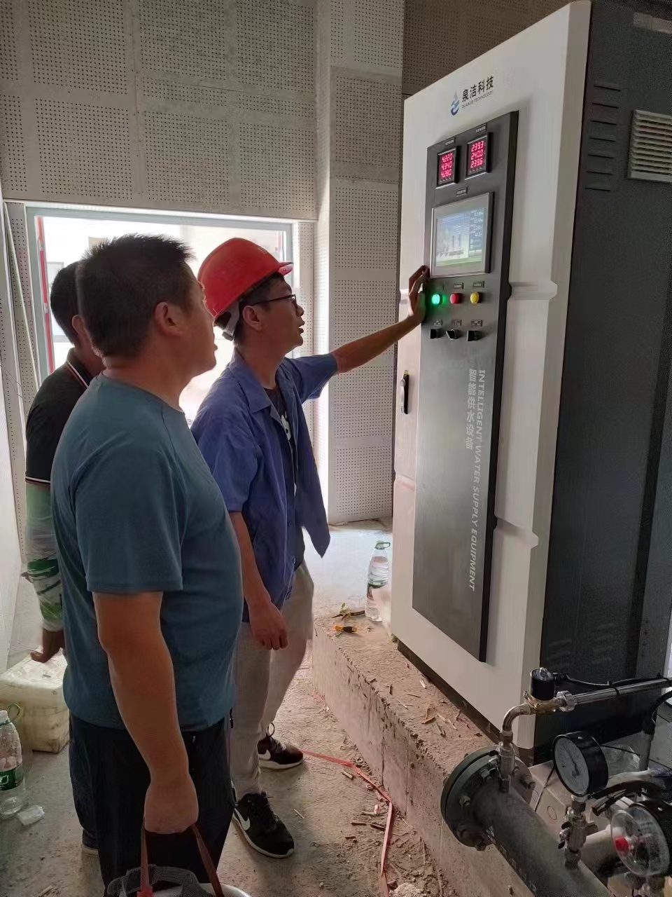 泉洁公司从7月8号开始荆州开发区第二中学泵房的勘查工作,与建设方确定泵房位置及尺寸。施工员随时跟进泵房施工进度,并按照建设方的要求不断修改加压设计方案,尽量满足对方的要求。考虑到时间上的紧迫性,在安排水箱进场安装制作的同时,联系厂家预先订做水泵机组及控制柜体,保证水箱施工完成后,水泵机组能够安装就位,好接着完成最后的设备接线调试工作。泉洁公司不敢丝毫马虎,经过紧张的一个半月努力,严格按照施工流程,顺利的调试好了设备,通上了水。并为了保证水质安全,我们还安装了在线消毒设备,24小时对水箱进行消毒;还聘请了专业水箱清洗人员对其水箱进行了二次冲洗工作,只为全校师生用上干净卫生的生活自来水。