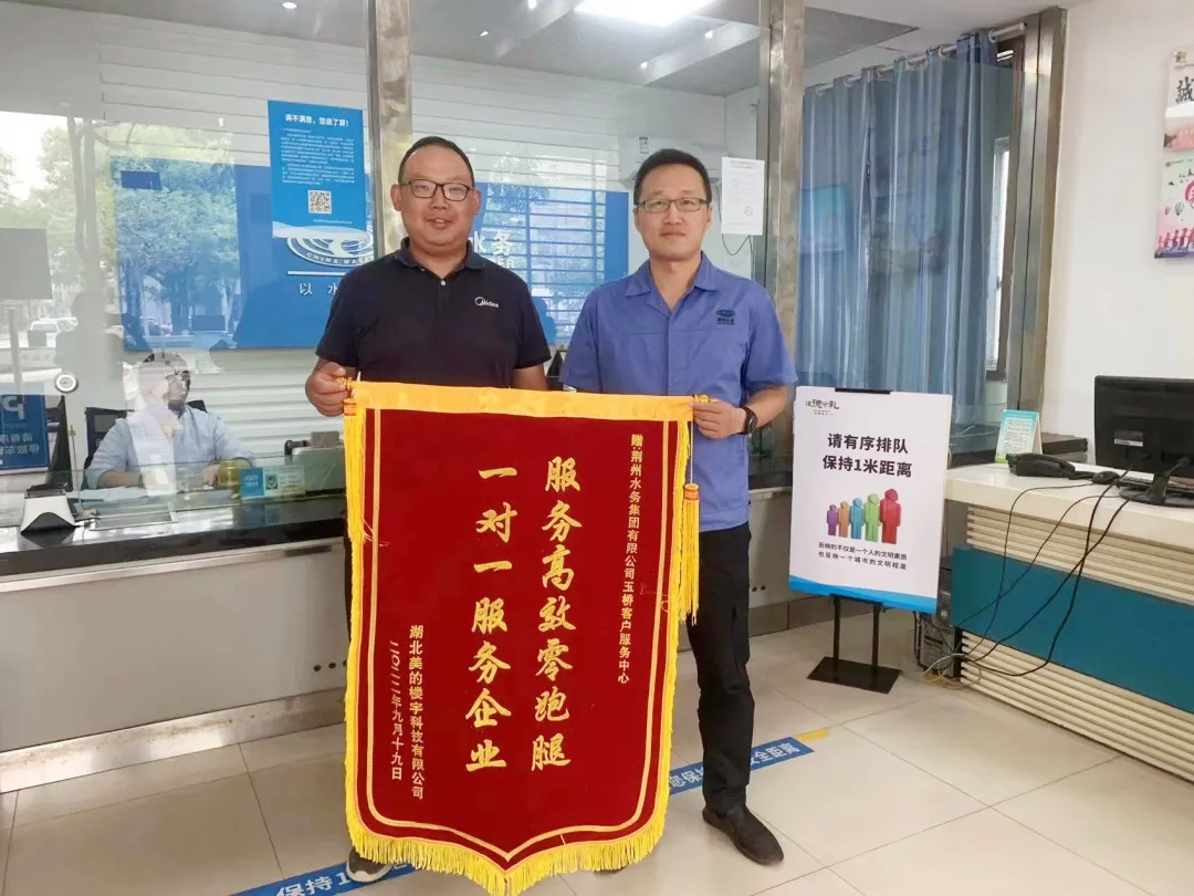 9月20日,湖北美的楼宇科技有限公司代表将一面鲜艳的锦旗送到了荆州水务集团玉桥客服中心。“服务高效零跑腿,一对一服务企业”的话语醒目而亮眼,充分表达了企业对公司及玉桥客服的服务效率、优化营商环境的认可和感激之情,美的楼宇科技代表激动地说:“玉桥客服帮办代办的靠前服务,贴心、暖情又高效,助力企业发展,真的感谢你们!”