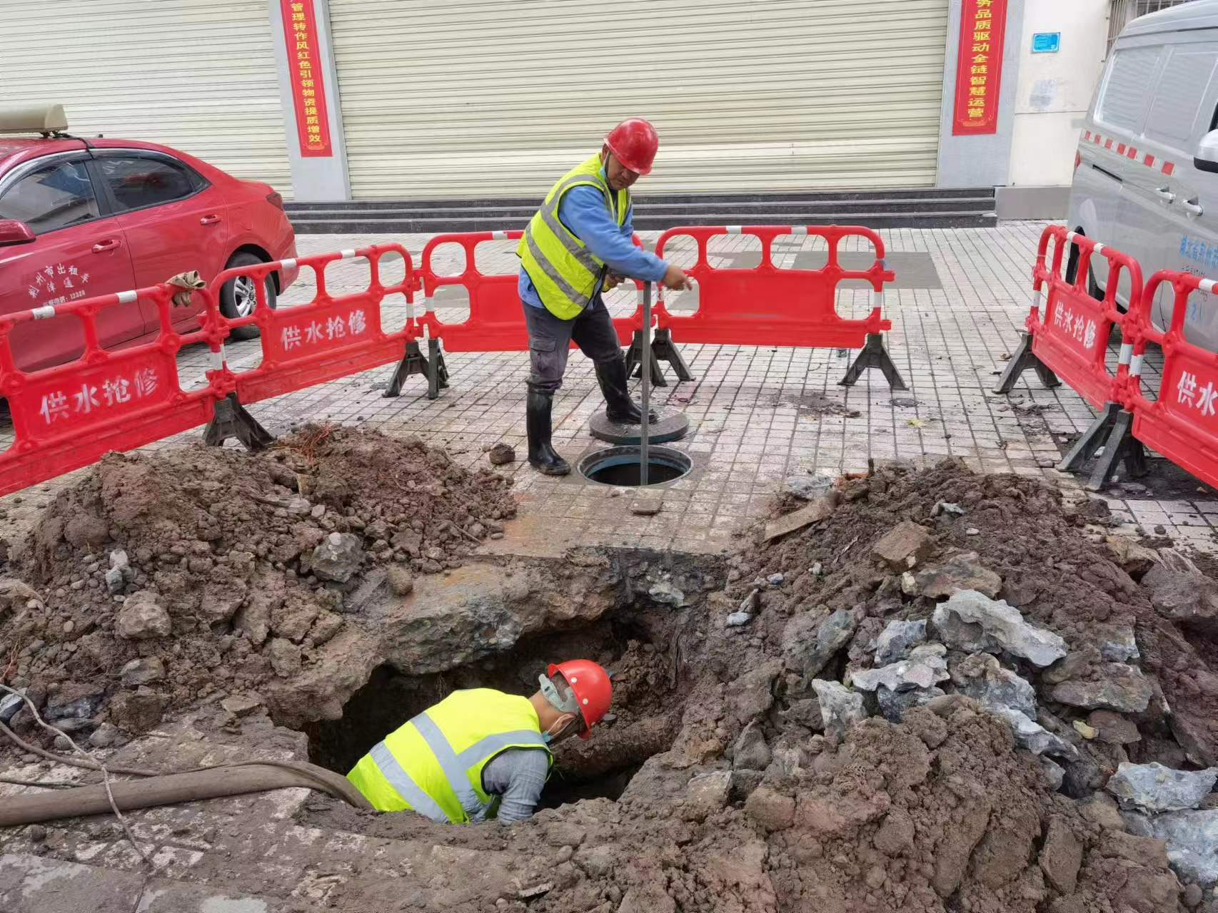 10月7日中午,金龙路一小区突然水压变低,用户纷纷打供水热线电话求助:家中无水或水压变小。疫情期间,居民基本上在家中隔离,没水用可真是发愁。接到求助电话后,管网抢修人员立即赶往现场,此时的街道因管控而清冷空旷,一场小雨将荆州拉进了寒冷的冬季,顾不上这些,维修人员赶到现场立即检查,最终发现是小区门口的供水管道被损坏发生渗漏,造成整个小区低压无水。该漏点位于小区外围商业门店前,业主停放的汽车正好占压在漏点上方。情急之下,维修人员立即与小区物业联系,快速寻找车主移车,经过紧张的接力,几位车主先后把汽车移走,维修人员开始进入紧张地维修中。因为着急赶来维修,他们错过了午餐时间,此刻也顾不上许多,在做好现场的安全防护后,直接进入紧张的工作。关闭管网阀门,开挖基坑,维修员跳入作业坑作业,一环紧扣接一环,在大家的共同努力下,终于赶在下午5点前,完成了维修并通水。