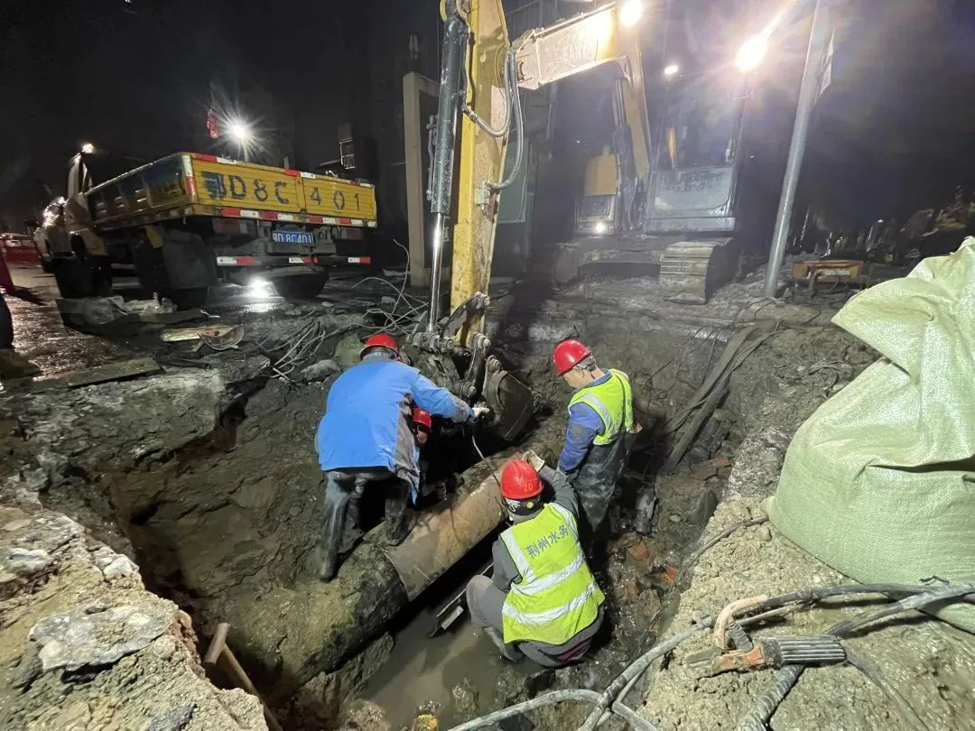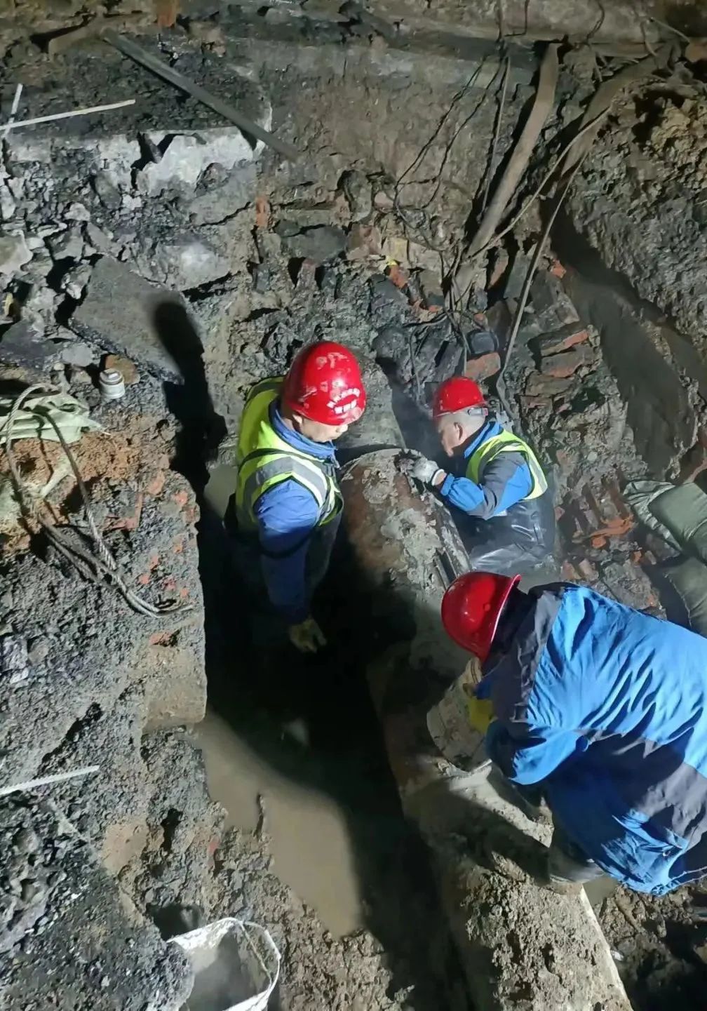 随着夜幕降临,在挖掘机的来回伸收之间,管道破损位置显露出来,抢修人员结合现场情况制定了修复方案,此时工作坑内不断有雪水和污水涌进,他们一边制做管道修复钢制件,一边加速对坑内积水进行抽排,寒风刺骨,时间已到晚上11时,此时条件具备,维修人员跳入工作坑里开始对管道进行修复,他们顾不上泥水脏冷,紧张而忙碌配合,加快速度维修,经过漫长而紧张的8小时奋战,凌晨4点钟维修工作全部完成,管线恢复供水。