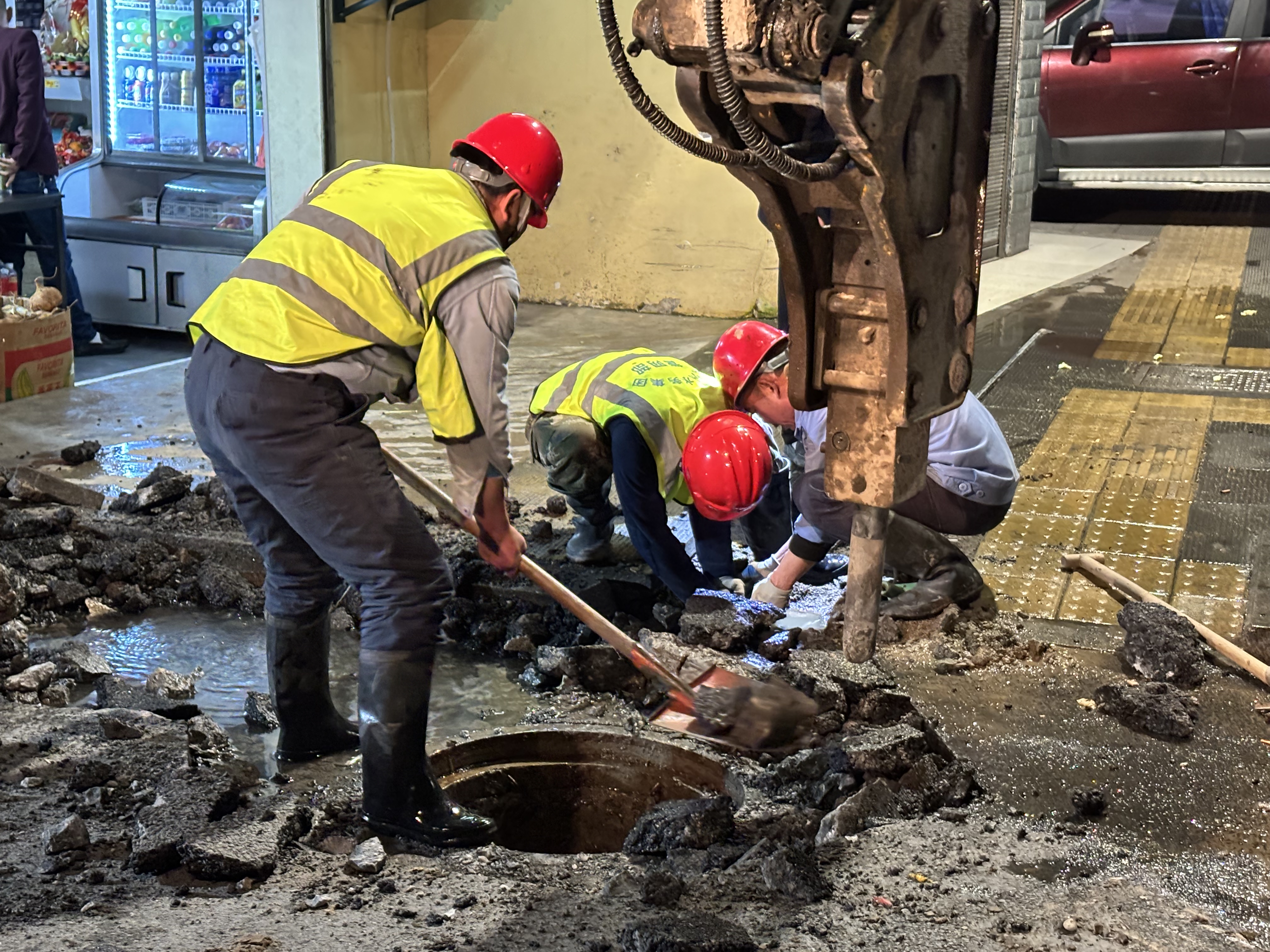 抢修方案确定后,荆州水务集团通过媒体宣传、社区工作群等方式提前做好停水告知工作,完成了施工机械、材料、技术人员调配,28日深夜11:30开始关停主管闸门,抢修工作进入攻坚阶段。经过与相关管线部门交涉后得知,该处主管西侧有6根电缆,主管正下方除了有40cm的水泥石块混合垫层外,还有市政排水管呈十字交叉排列,下方开挖只能采取人工开挖的方式。为在天亮前完成抢修任务,管网抢修队调配6名抢修员轮流开挖作业坑,与以往开挖不同的是,此次开挖要挖除的不止是泥土,还有坚硬的水泥石块混合垫层。