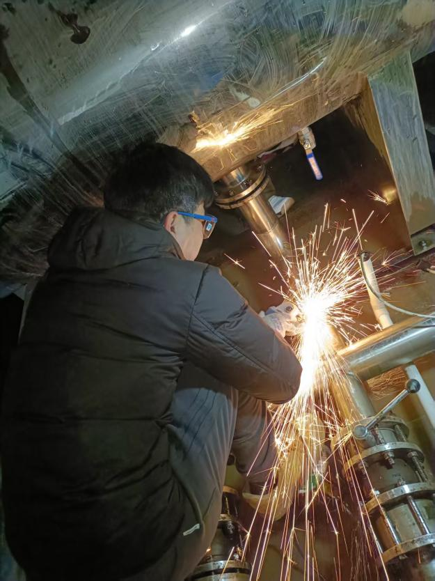 一个多小时过去了,当积水终于降至焊工的可作业范围,真正的考验才刚刚开始。渗漏点位于管壁接缝的夹层部位,既要保证焊接强度,又要防止高温引发设备变形。豆大的汗珠顺着安全帽带滑落,王勇却始终保持着焊枪的稳定轨迹。连续两个小时保持跪姿作业,工服后背早已被汗水浸透。