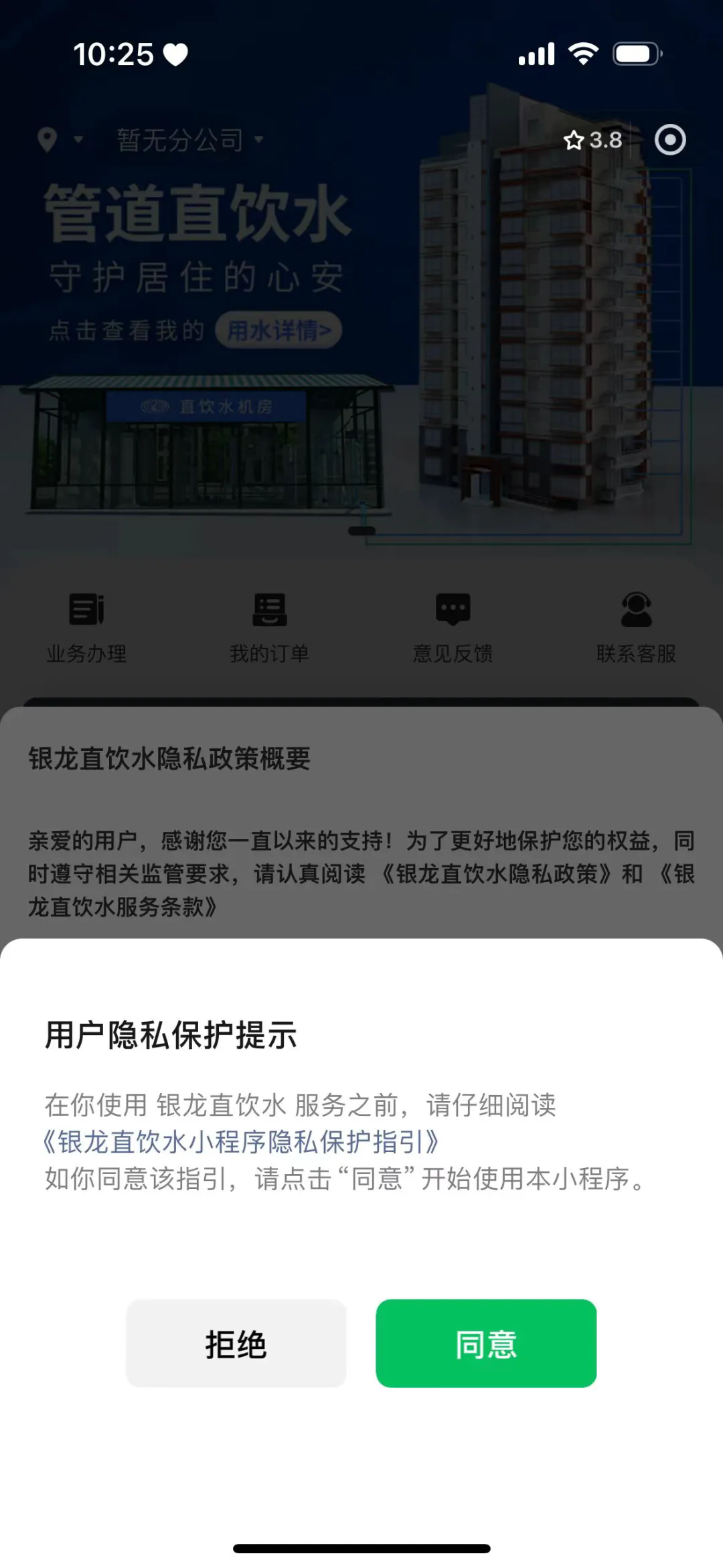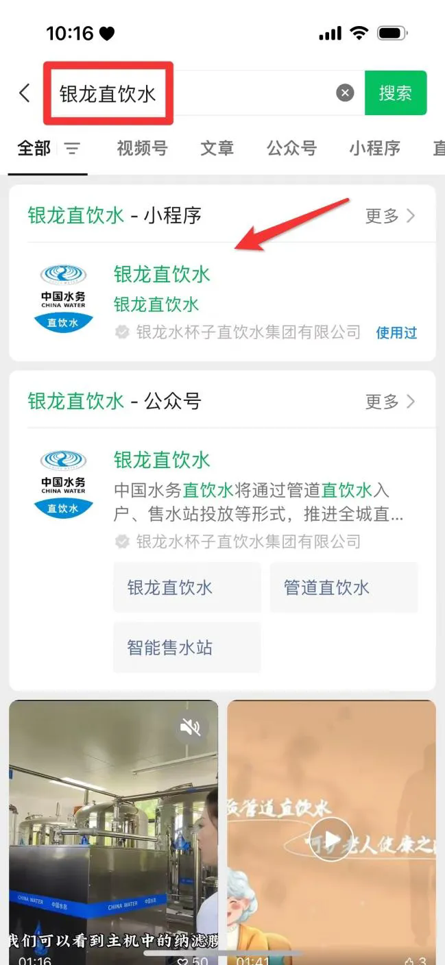 第一步:微信搜索框搜索“银龙直饮水”,点击下方“银龙直饮水小程序”--“同意”;