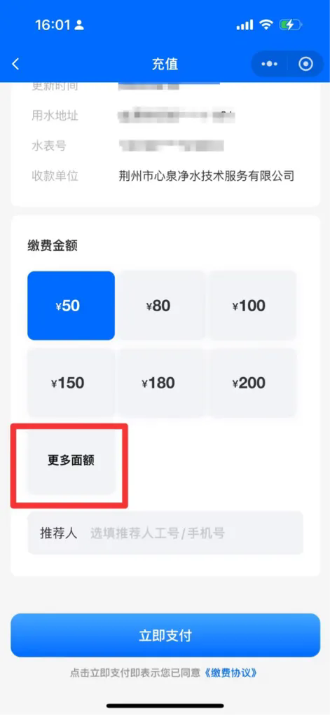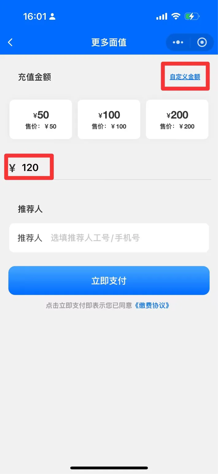 第二步:可选择已有6个固定金额直接支付,也可点击“更多面额”--“自定义金额”,完成立即支付即可。