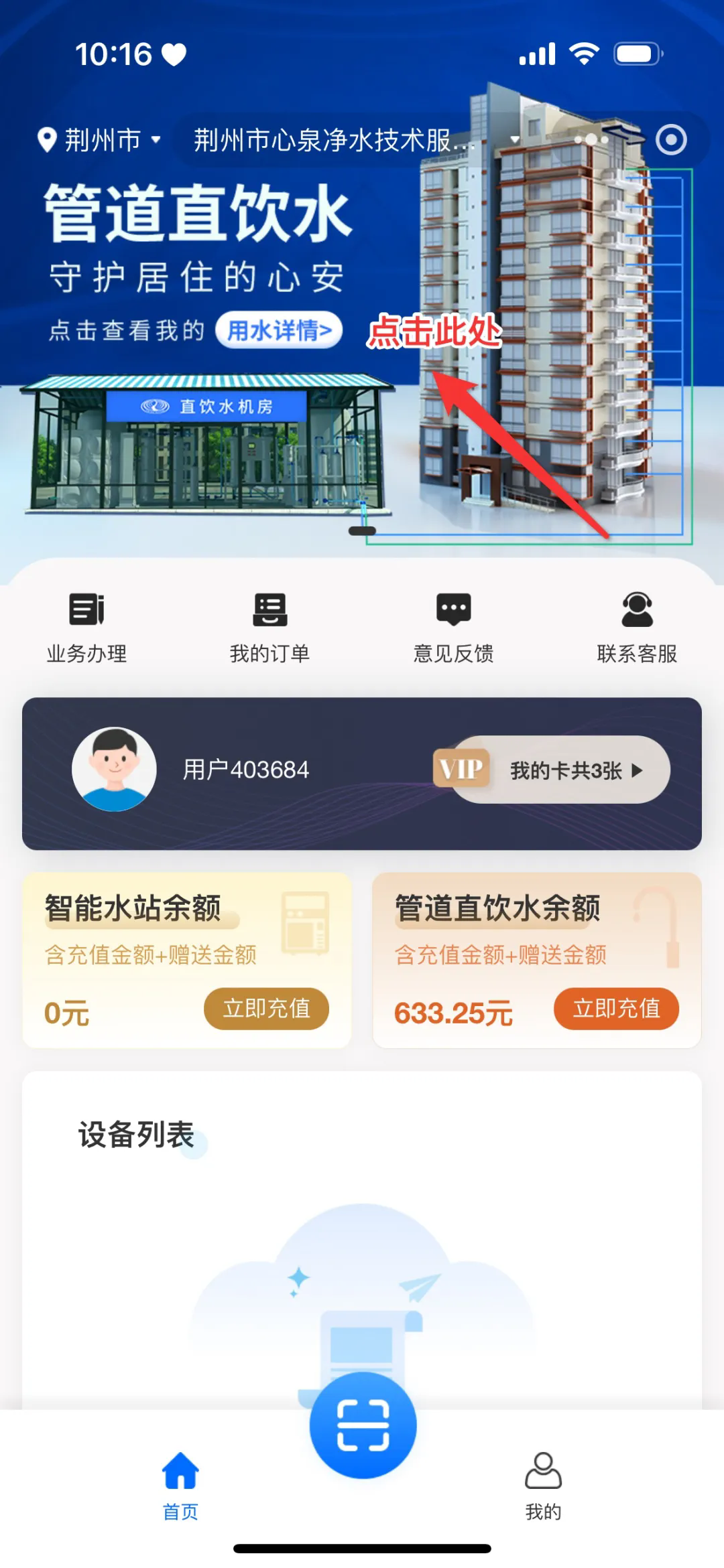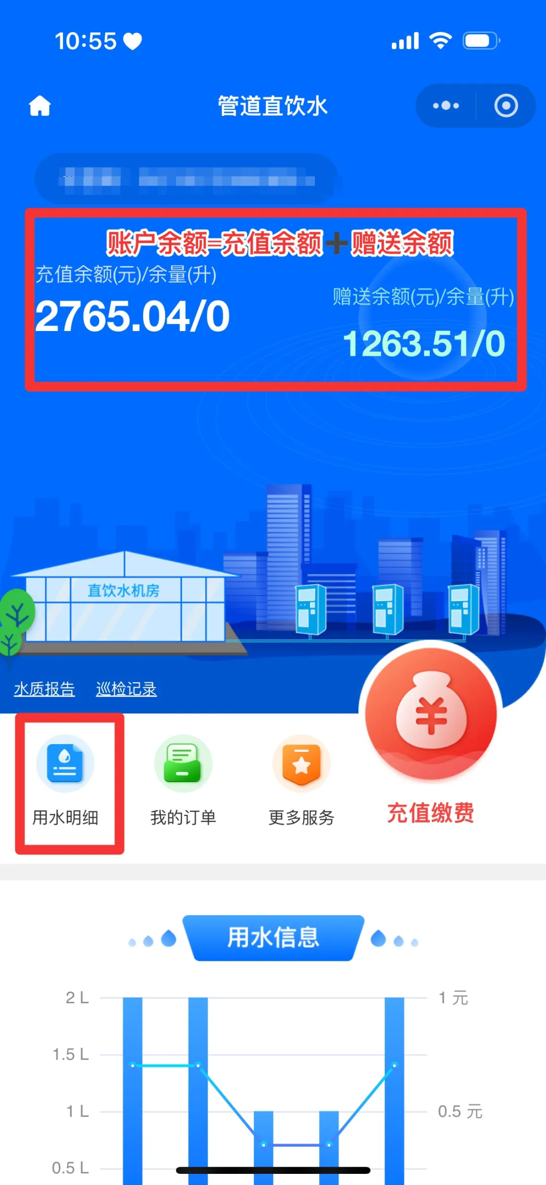 进入“银龙直饮水”小程序主页面,点击“用水详情”,可查看用水明细以及账户余额。