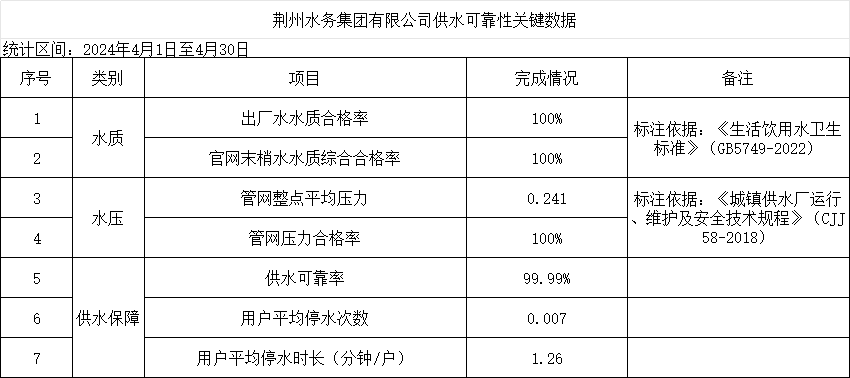 2024年4月荆州水务集团有限公司供水可靠性关键数据