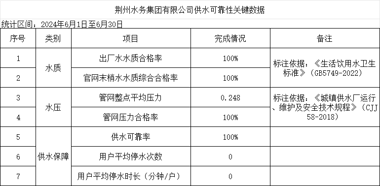 2024年6月荆州水务集团有限公司供水可靠性关键数据