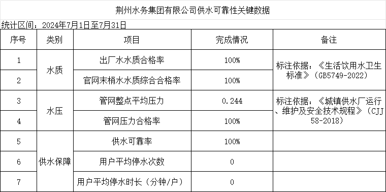 2024年7月荆州水务集团有限公司供水可靠性关键数据