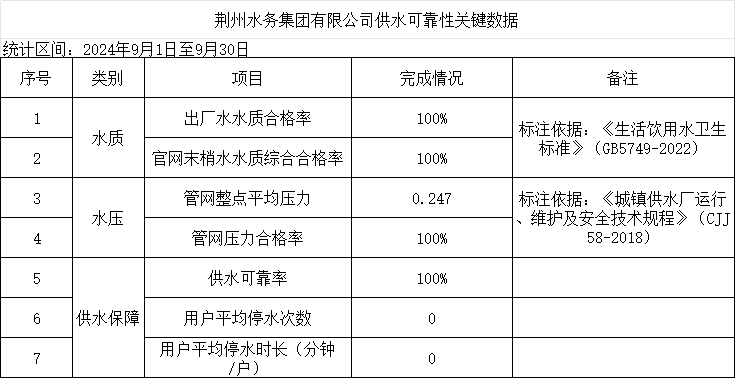 2024年9月荆州水务集团有限公司供水可靠性关键数据