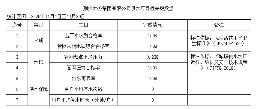 2025年11月荆州水务集团有限公司供水可靠性关键数据