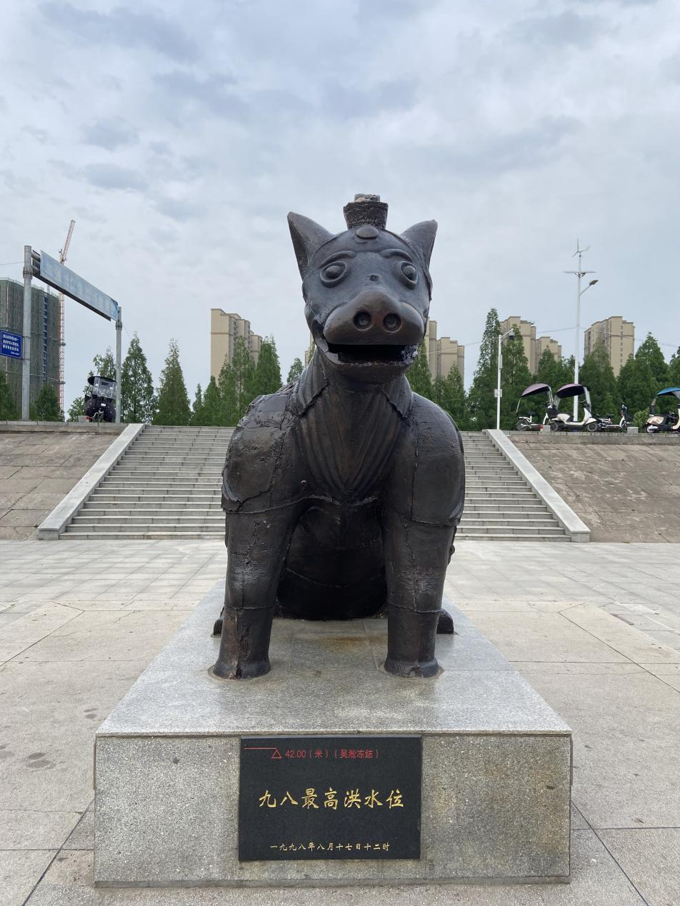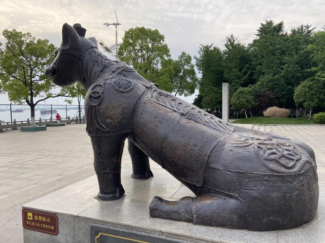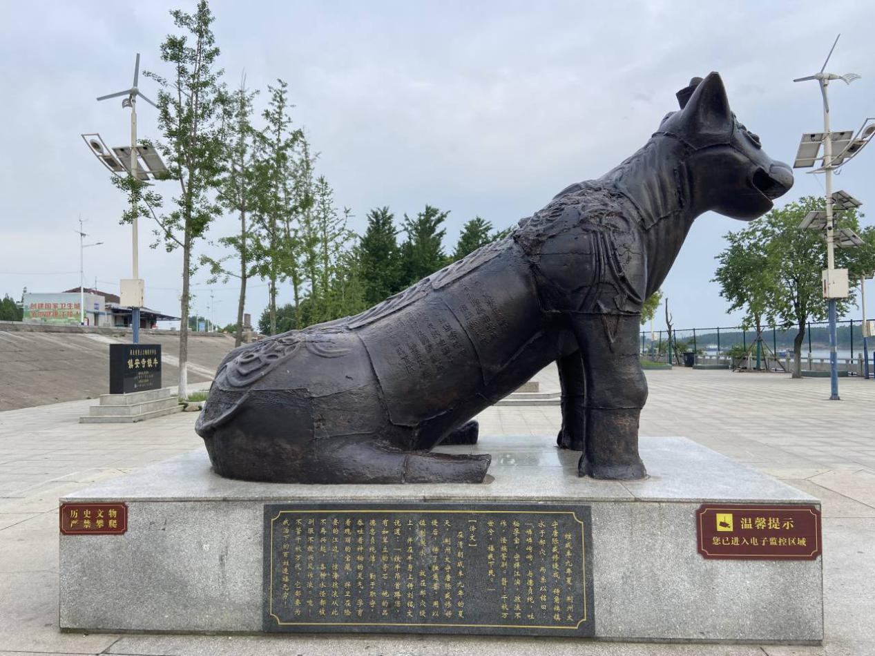 在江陵县郝穴镇,有一只坐落在荆江大堤的铁牛,因所处地段位于原镇安寺湾,故称镇安寺铁牛,是江陵县境内具有较高历史文化价值的文物。铁牛坐东朝西,凝视长江,背抵荆江大堤,坐落滨江公园。
