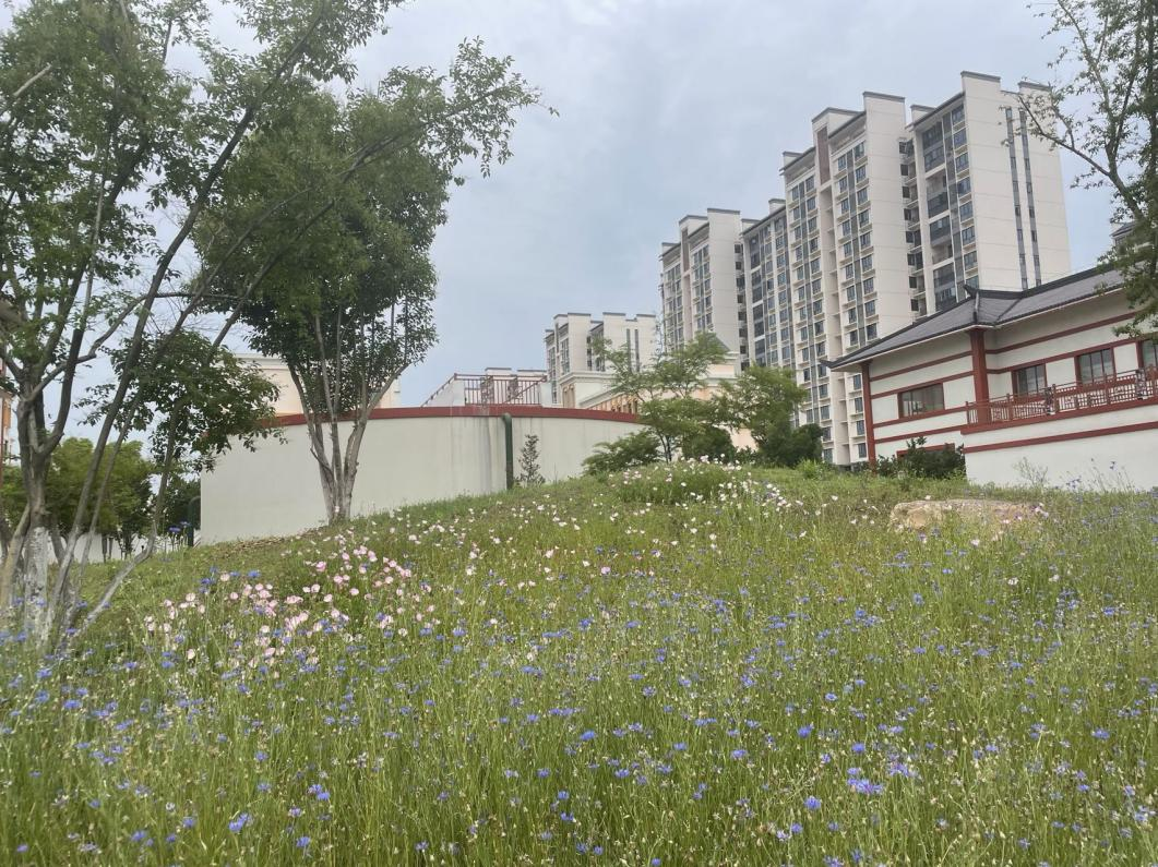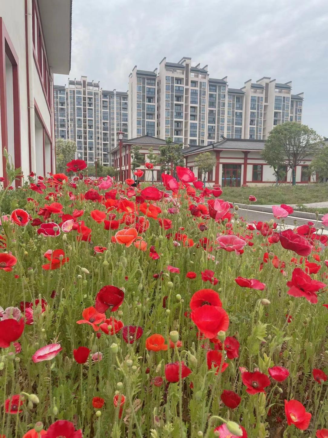 再往里到综合楼下,就能看到大片的虞美人和蓝色矢车菊了。虞美人在清风的吹拂下,花枝摇曳,薄薄的红花瓣不住颤动,与蝴蝶抖动的白翅膀相映成趣,美丽极了,“春花秋月何时了?往事知多少。”虞美人自带的这种忧郁气质,不知又要迷倒多少看客?