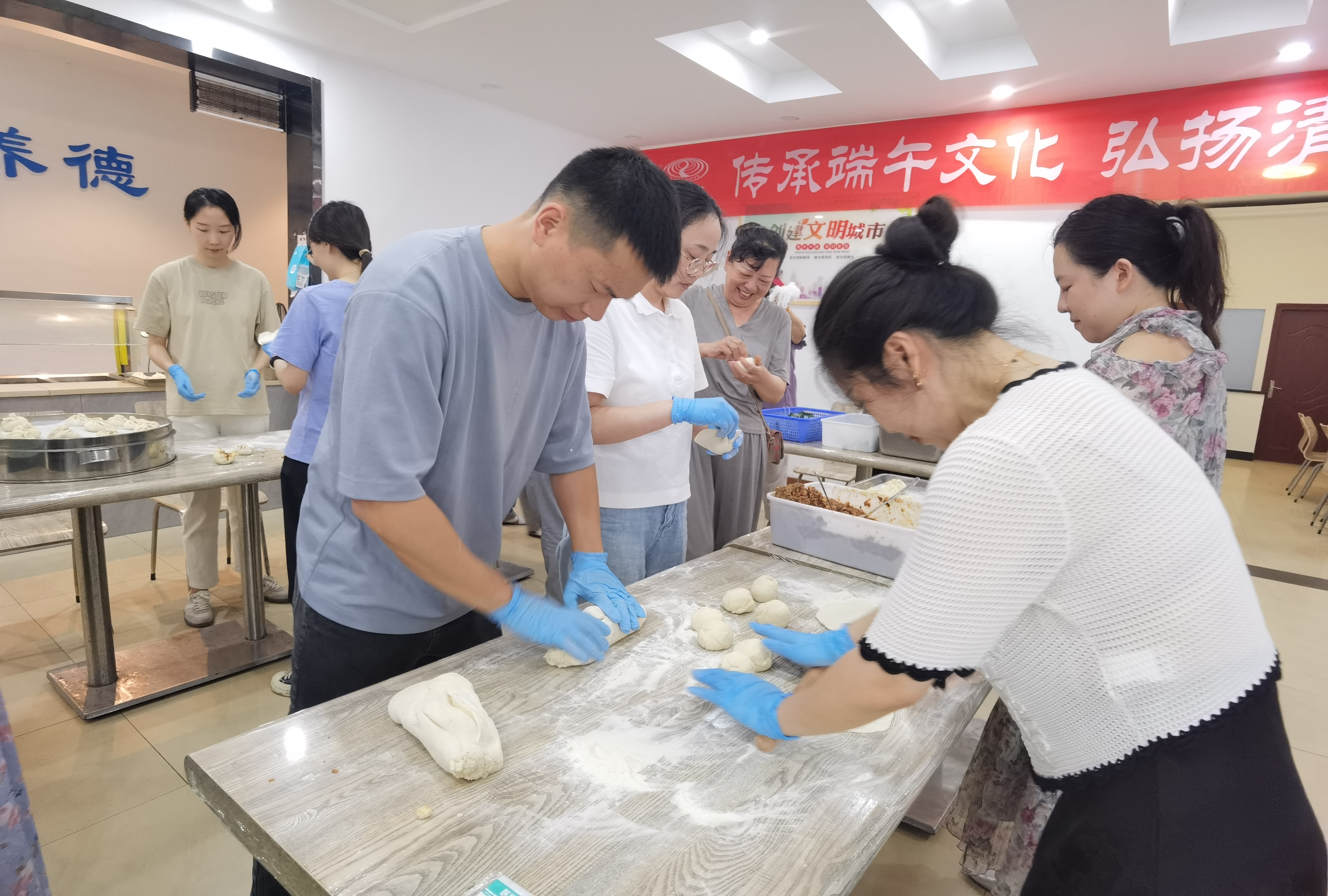 活动现场,温情涌动。荆州水务集团特别邀请了员工家属代表走进企业,与员工们齐聚一堂。一双双巧手在翠绿的粽叶与雪白的糯米间翻飞缠绕,一个个棱角分明、饱含心意的粽子逐渐成型;蒸笼开启,亲手制作的包子热气腾腾,香气四溢。这不仅仅是传统美食的制作,更是家企之间情感的纽带在劳动与合作中紧密联结。