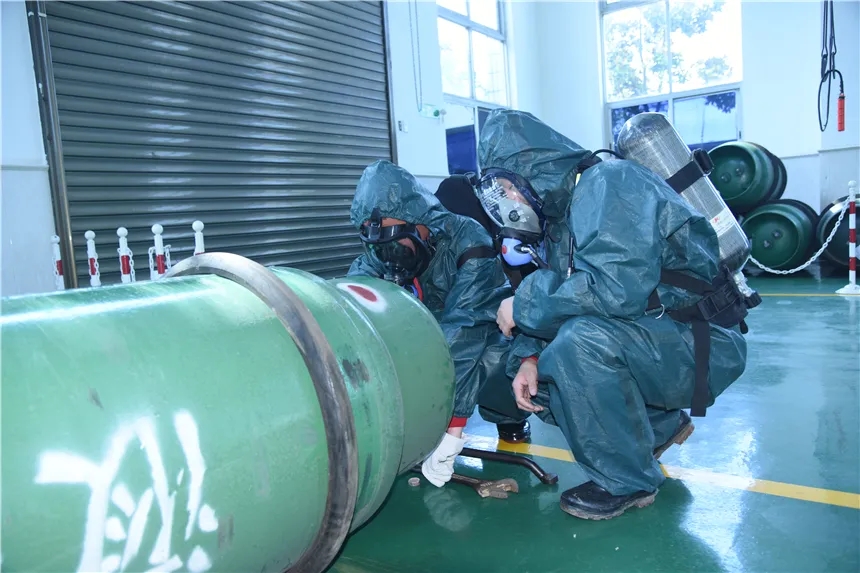 电气火灾演练结束后,郢都水厂加氯间的警报声响起,氯气泄漏应急演练拉开序幕,厂长王亚迅速向总指挥报告。总指挥立即启动预案,各救援小组迅速就位。抢险小组佩戴空气呼吸器,开启氯气回收装置后,进入加氯间排除险情。疏散小组立即疏散人员至安全区域。抢险小组在查明液氯泄漏点和原因后,立即采取堵漏措施进行排险。抢险组成功排除险情,在确认泄漏点完全修复并无复发后,向总指挥报告,总指挥宣布本次应急救援演练结束。