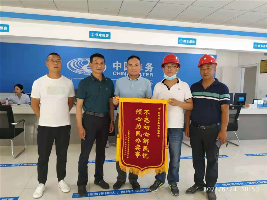 “真是太感谢了,帮我们解决了用水难题!”6月24日、25日上午,凤凰街道办事处江河村、清河村居民委员会将两面绣有“不忘初心解民忧,倾心为民办实事”、“为民服务见真情,饮水思源颂党恩”的锦旗送到鼎鑫源工程公司,感谢工作人员优质高效的服务,赠送锦旗的张书记由衷感叹:“施工人员连夜加班为我们解决问题,设身处地的为老百姓着想,实在是太好了!”