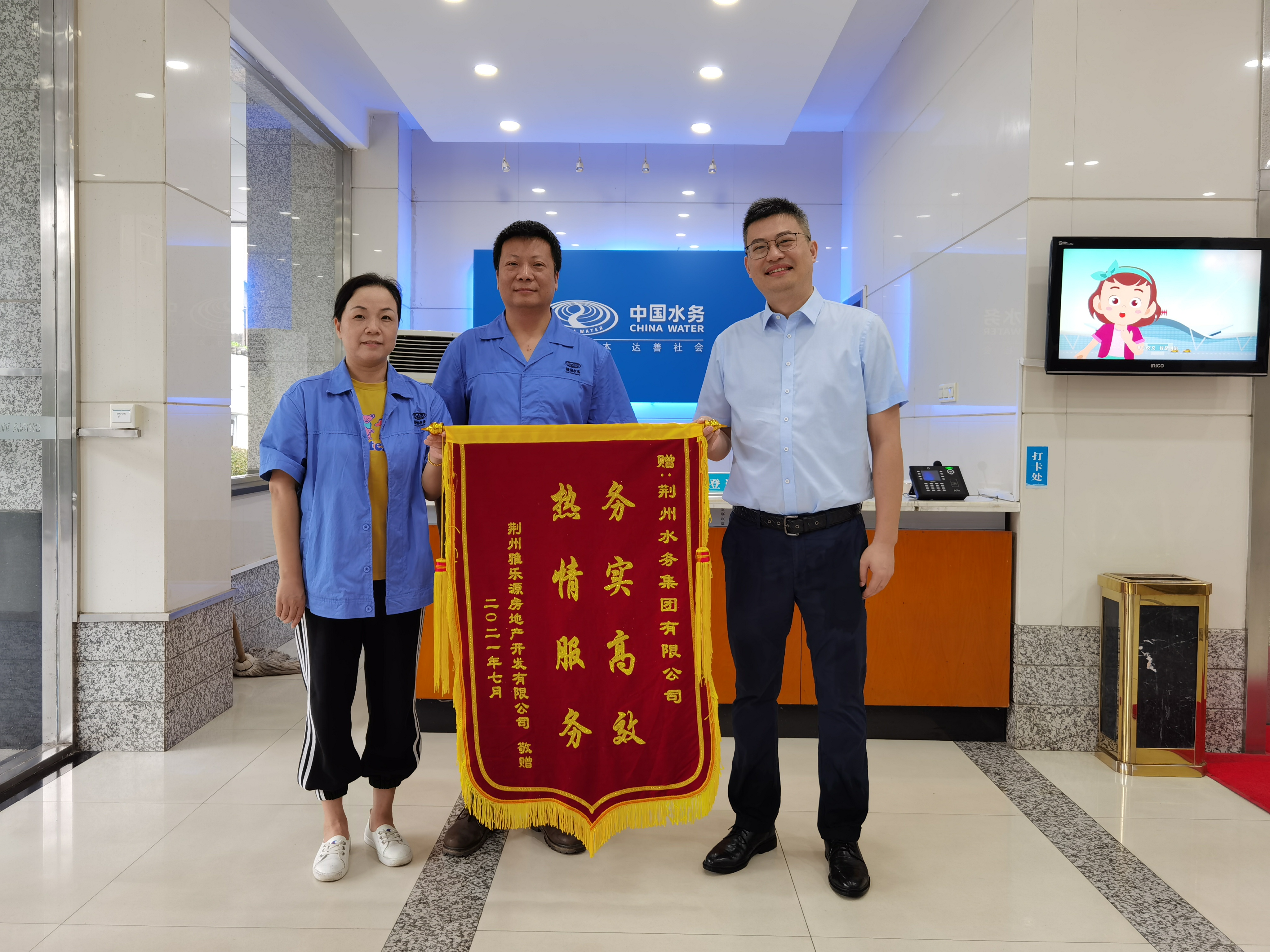 7月12日上午,荆州雅乐源房地产开发有限公司负责人将一面写着“务实高效 热情服务”的锦旗送到了荆州水务集团鼎鑫源工程公司负责人手中,以此感谢荆州水务集团为其提供高效便捷的服务。