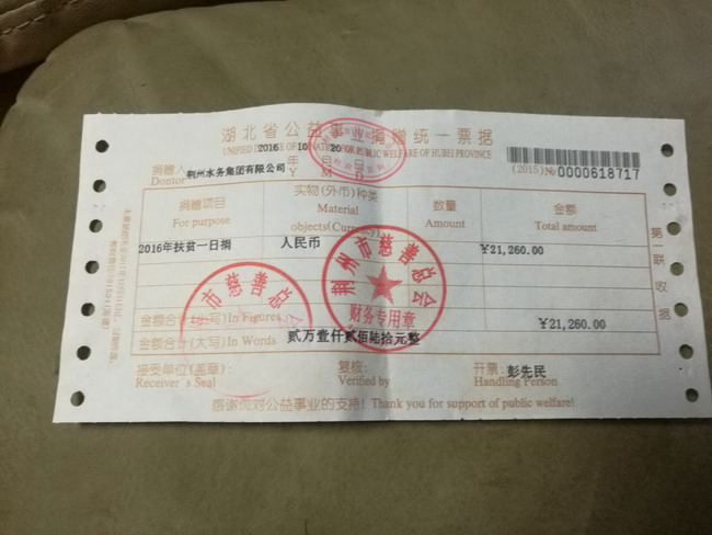 今年10月17日是全国第三个“扶贫日”,荆州水务集团为响应全市“精准扶贫你我同行”活动号召,在全公司组织开展了“扶贫一日捐”活动,共筹集捐款21260元。