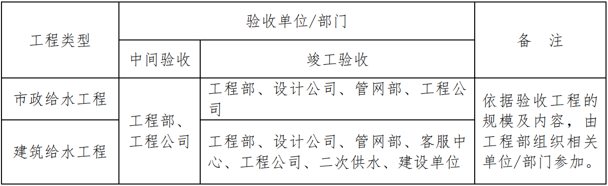 荆州水务集团给水工程分市政给水工程(公司管网改造、新建工程)和建筑给水工程(立户、分户工程)。 工程验收分中间验收和竣工验收。
