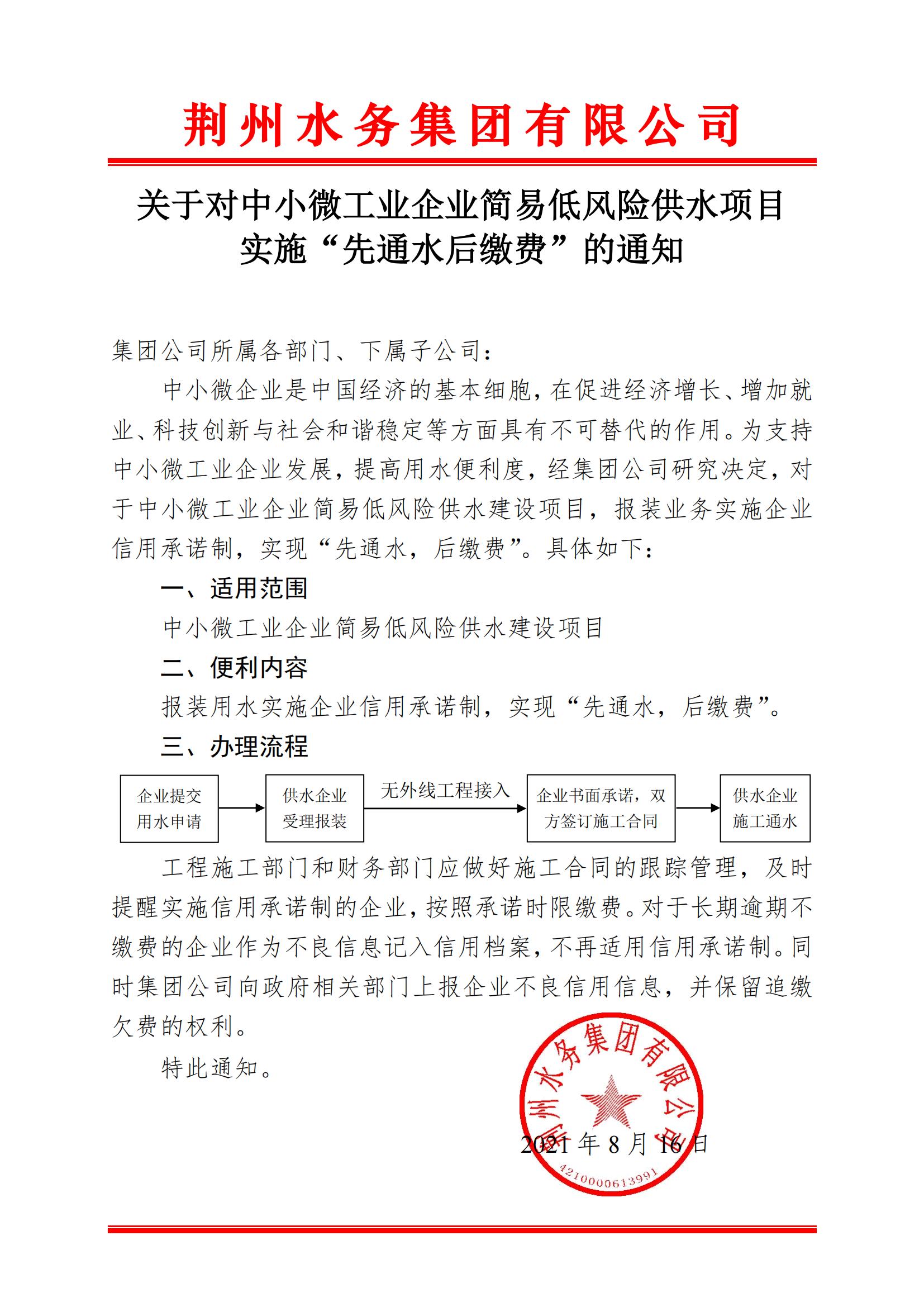 关于对中小微工业企业简易低风险供水项目实施“先通水后缴费”的通知